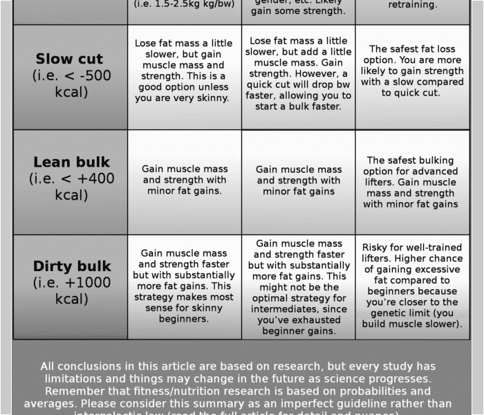 - Muscle gain is likely optimized in a caloric surplus, though an aggressive surplus may lead to excess fat gain.