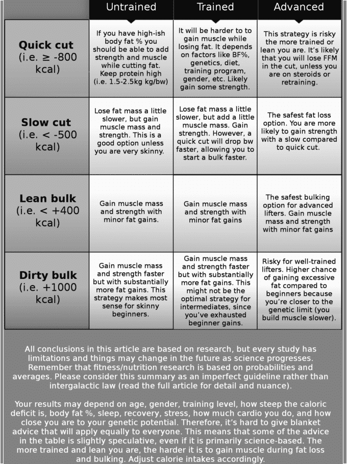 For a novice lifter beginning to resistance train, I recommend eating 0-500 kcals/day (on average) below maintenance intake. As a novice lifter, you are likely to lose fat and build muscle simultaneously, thus you should roughly maintain calorie intake to support muscle growth, while it’s as fast as it’s ever going to be. Even if you do not lose weight, there’s a good chance that you’ve built muscle and lost fat at a similar rate. When cutting, generally aim to lose .5-1% of your body weight per week.