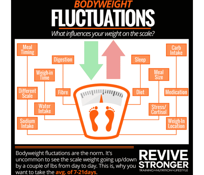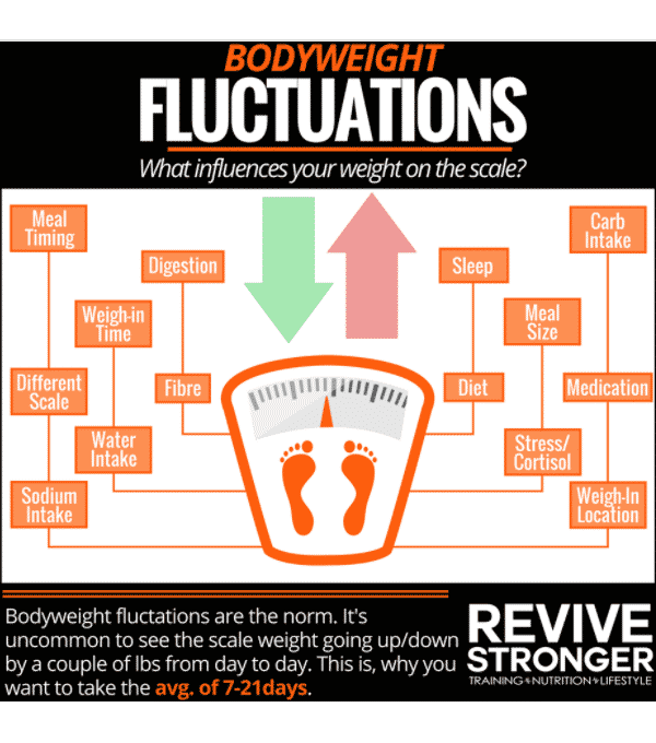 I also recommend establishing the habit of weighing in daily. Again, you can’t manage what you can’t measure, and weight is the primary (surrogate) measure for tracking changes in body composition. Self-monitoring weight is also associated with better weight management. However, note that weight fluctuates considerably on a daily basis, so do not overreact to an unexpectedly high/low weigh in. Weight can fluctuate due to differences in stress levels, hydration status, menstrual cycle phase, bloating, carbohydrate/fiber/sodium/mineral intake, food weight, and creatine levels. You should therefore establish a weekly or bi-weekly (baseline) average weight. Compare weekly averages, rather than daily weigh-ins, to ensure that you notice meaningful weight changes when you alter energy intake. If daily weigh-ins are impractical, then you should weigh in at least 3 times per week. Though useful, the scale is not the end-all be-all. I suggest you supplement weigh-ins with progress pictures (see how-to), because you might look better (if you’ve gained muscle) despite weighing the same/more.