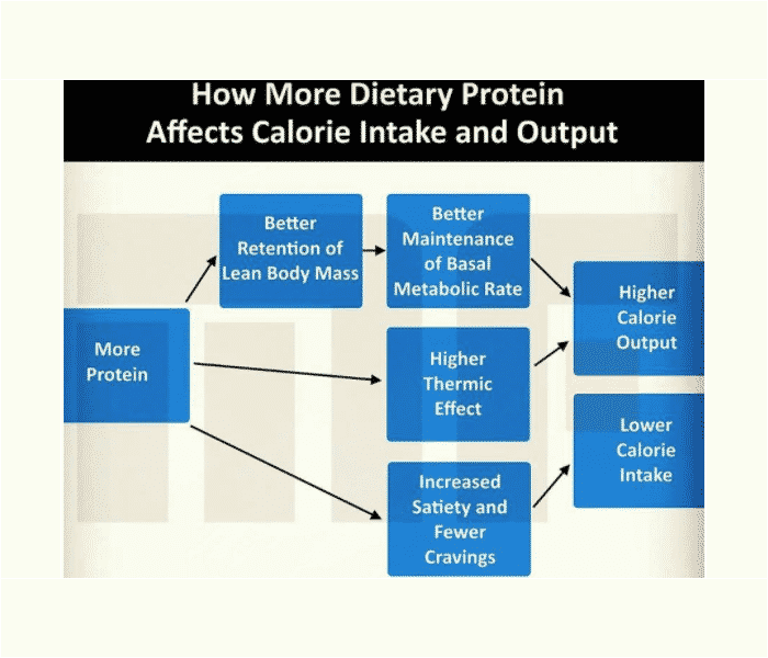Protein sources are highly satiating, thus adding protein to your diet is likely beneficial for weight loss via hunger reduction, increased thermogenic effect, and decreased energy efficiency. Additionally, protein helps ensure greater muscle retention (for equivalent caloric intake) as compared to carbohydrate or fat during weight loss. Further, eating more protein when “bulking” produces less fat gain despite similar muscle growth. However, while protein intake permits muscle growth, resistance training stimulates muscle growth. You won’t grow much muscle by just eating protein without resistance training.