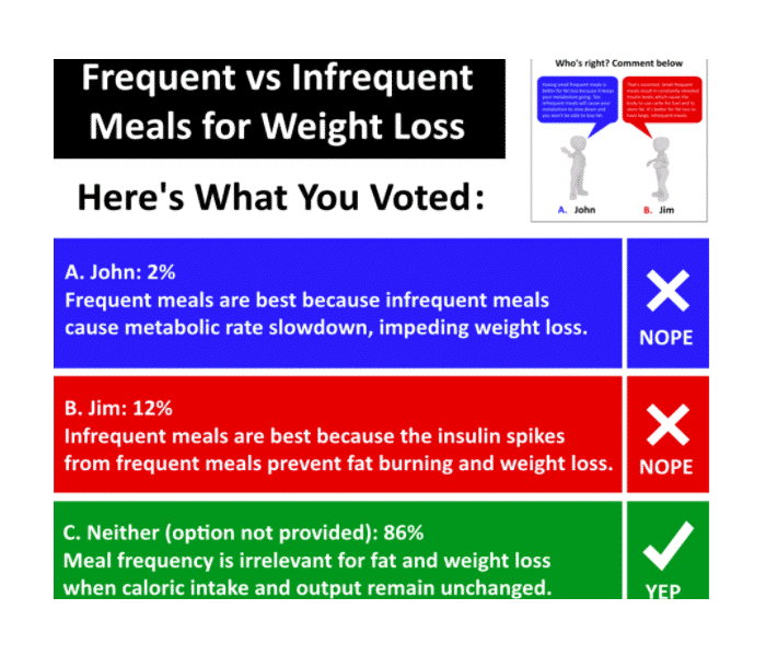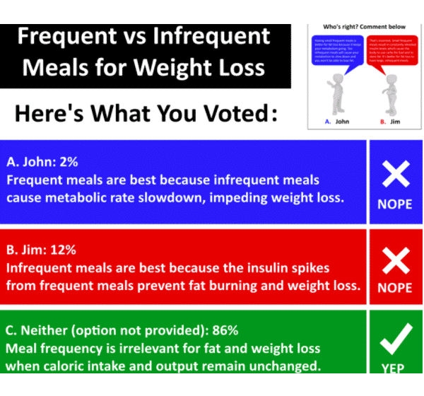 Try to maintain roughly consistent meal timing and frequency (±1.5 hours). This promotes improvements in circadian rhythm, better metabolic responses to feeding, a higher thermic effect of feeding (more calories burned), and more consistent weigh-ins. Consistent meal timing is also associated with successful weight loss maintenance.