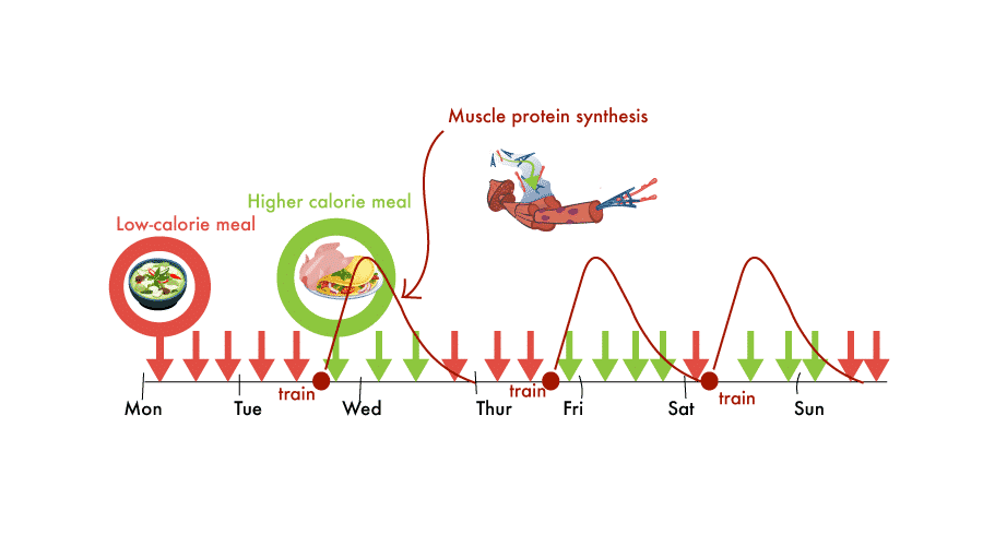 - Any weekly distribution of energy intake is viable. It is fine to consume more/less calories on training/non-training days (±200 kcals).